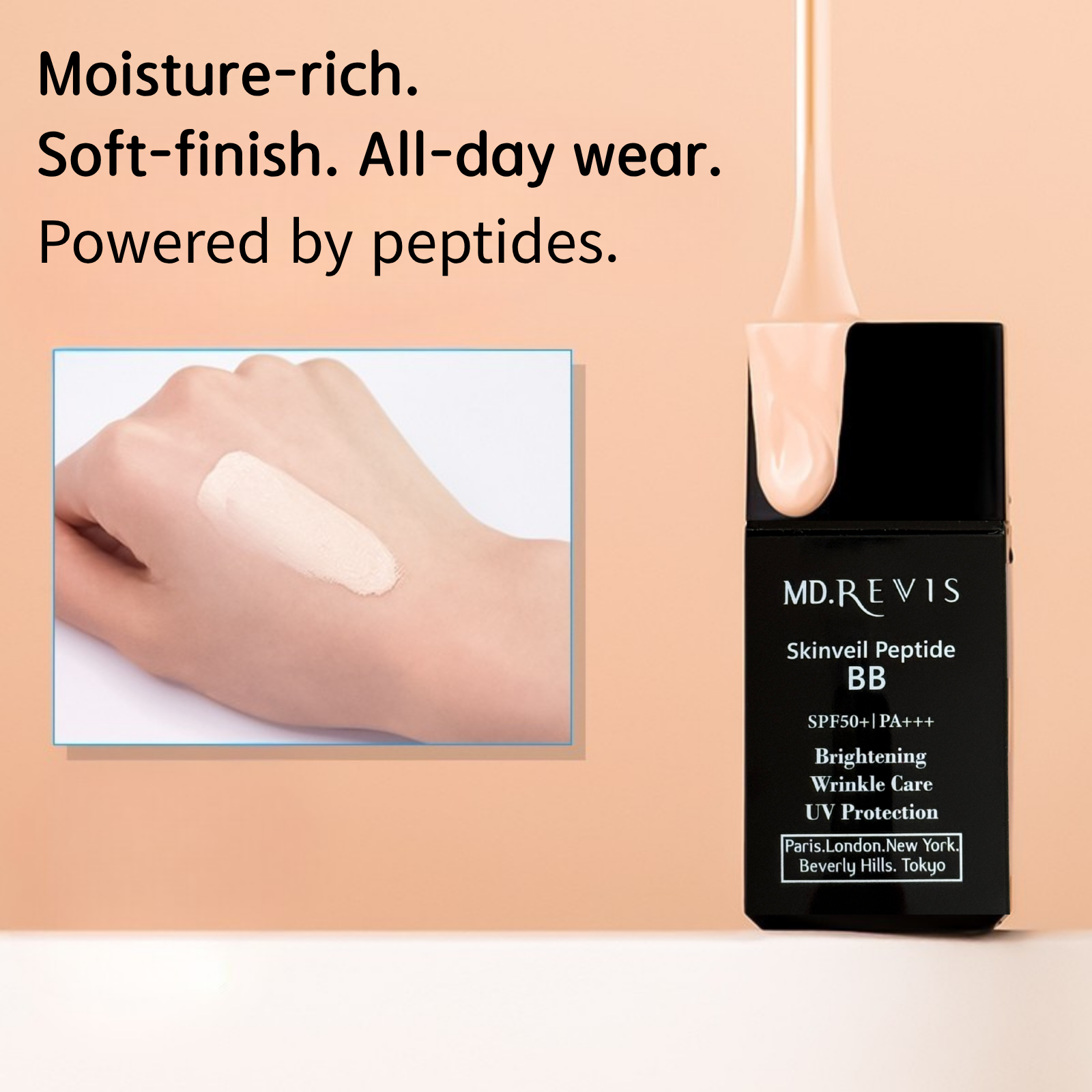 Achieve flawless, natural-looking skin with MD REVIS Skinveil Peptide BB Cream. This lightweight yet powerful BB cream offers triple functionality—whitening, wrinkle care, and UV protection—all while maintaining hydration and soft adhesion to the skin.